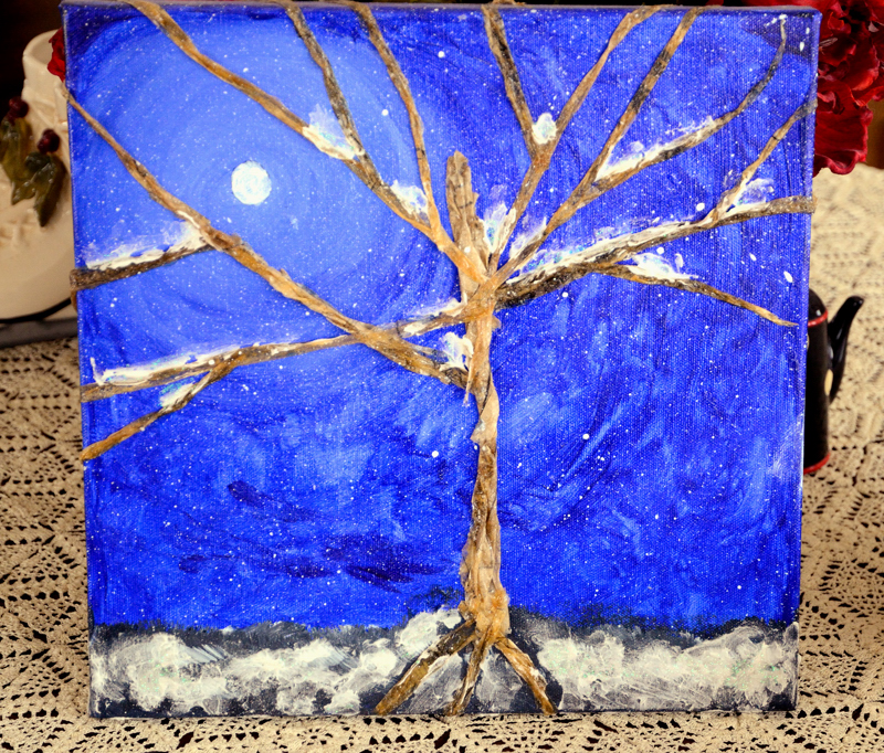 This is a picture that my son Tyler painted for me in school several years back. I love this picture! It was painted and then branches put on somehow to make it dimensional. Now he does not like doing artwork not even one little bit, he did this in a class, and I will never see any painting from him again I can be sure. I am happy to have this one, it speaks to me, there is just something about it, and I could not love it more since it came from his hands. The blue is brighter here than it is in actuality.